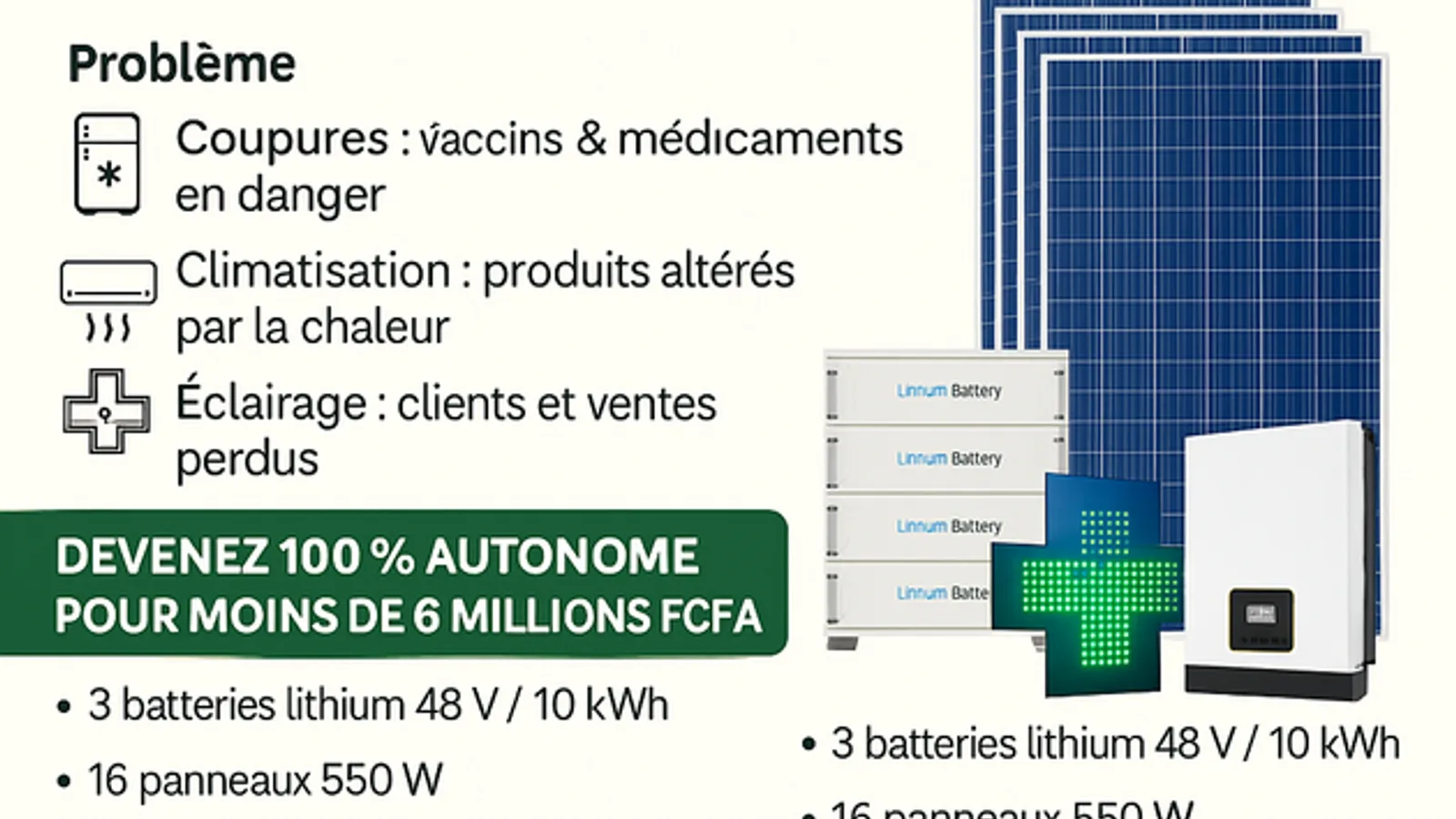 L’électricité instable et coûteuse menace vos vaccins, vos équipements et vos marges. Découvrez comment un système solaire complet vous libère du réseau tout en réduisant vos impôts.